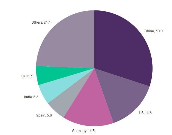 截至2016年,中國成為全球最大的風力渦輪機市場,占全球市場份額的30%。預計到2025年,中國仍將保持第一位,占27.4%。其次,美國是全球第二大風力發(fā)電市場,2016年全球市場份額的14.6%,預計到2025年還將繼續(xù)保持第二。此外,作為歐洲最大的風電市場,德國在2016年占據了14.3%的市場份額,預計2025年將減少到11.9%的份額。預計印度2025將由2016年5.6%的市場份額增長到6.4%。最后,英國的份額預計將從2016年的5.3%增長到2025年的7.1%。