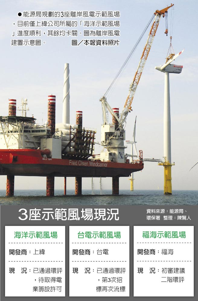 能源局規(guī)劃的3座離岸風(fēng)電示范風(fēng)場(chǎng),目前僅上緯公司所屬的「海洋示范風(fēng)場(chǎng)」進(jìn)度順利,其余均卡關(guān)。圖為離岸風(fēng)電建置示意圖。圖/本報(bào)資料照片 3座示范風(fēng)場(chǎng)現(xiàn)況