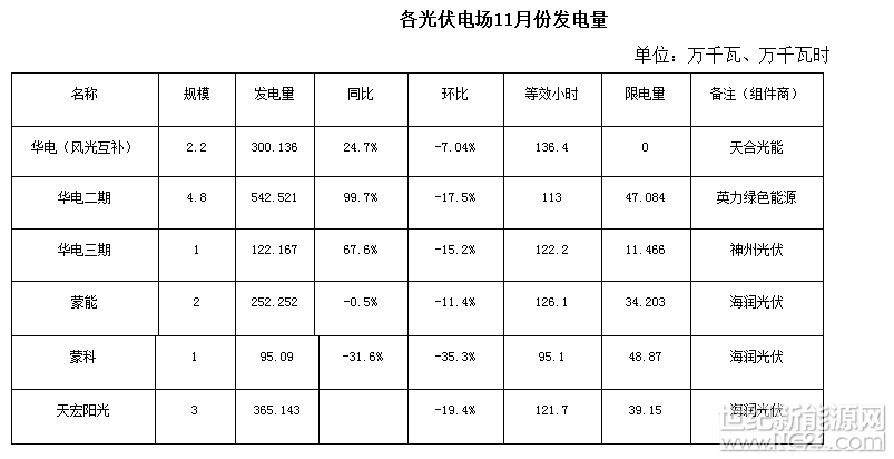 全市光伏電場(chǎng)11月份發(fā)電情況